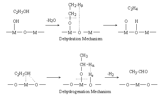 The purpose of this study was to examine the validity of Mechanisms I and II using the DV-Xa method. For this purpose, models of the transition states of the mechanisms were made and submitted to computation, and we then examined whether the two dependencies of the computed values of parameters and the reaction selectivities on the kind of oxides agreed well with each other. With regard to Mechanisms I and II, the electronic states of ethoxide interacting with surface O or Hs and of ethanol concertedly interacting with surface M and O were respectively computed and examined.