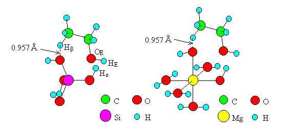 For the dehydration on oxides by Mechanism II (Figure 2) [5] of Eucken and Wicke, transition state models including one M per model were created (Figure 5, the cases of SiO2 and MgO are shown as examples). Bond angles of O-M-O (one of the two O's interacts with Hb of ethanol) were made equal to 90 (oxides of Ti, Mg, Mn and Cd) or 109.5 (oxides of Si and Zn). The other bond angles were made equal to those in the models of Mechanism I. The bond distance of the O-Hb bond was made equal to 0.957A, which is that of the O-H bond of water, and eight atoms and ions (M, O, Hs, OE, C, C, Hb, O) were placed in a plane. The computations were carried out for the models of six oxides as in the case of Mechanism I.