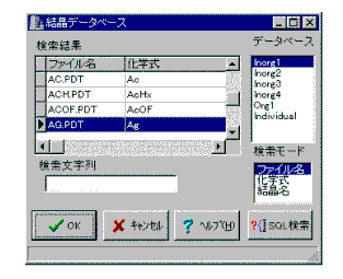 3 $B%"%W%j%1!<%7%g%s$N 3.1 $B6u7d$NG'<1(B 3.1.1 $B6u7d0LCV$r?tCM$GI=<((B $B@_Dj%@%$%"%m%0%\%C%/%9$G8!:w>r7o(B($B%9%-%c%s4V3V(B,$B8D?t!&6u7dH>7B$J$I(B)$B$r;XDj$9$k$3$H$K$h$j$=$N>r7o$K9g$&6u7d$N:BI8$H$=$NH>7B$,I=<($5$l$k(B(Figure 4)$B!#$^$?!"(BVRML($B2>A[8=)[8]$B$K$h$C$F!"6u7d>pJs$,(B3D$BI=<($5$l$k(B(Figure 5)$B!#(B Figure 4 Dialog window displaying calculation results. (Crystal: Al2MgO4, scanning step(dx=dy=dz=) 0.001, 100 vacant spheres) Figure 5 Display of vacant spaces using output file of VRML script. (Crystal: Al2MgO4, scanning step(dx=dy=dz=) 0.001, 100 vacant spheres) $B!!(B 3.1.2 $BFCDj:BI8$N6u7dH>7B(B $B@_Dj%@%$%"%m%0%\%C%/%9(B(Figure 6)$B$G!"6u7dH>7B$rCN$j$?$$:BI8(B(x$B:BI8!&(By$B:BI8!&(Bz$B:BI8(B)$B$r;XDj$9$k$3$H$K$h$j!"$=$N:BI8$K$*$1$k6u7dH>7B5Z$S6a@\86;R$,I=<($5$l$k!#(B Figure 6 Display of vacant sphere radii and neighboring atoms on the ordered coordinate. $B!!(B 3.1.3 $BC10L3J;RFb$N6u7d0LCV(B $B8!:w$7$?$$6u7d$N:G>.H>7B!&:GBgH>7B$rF~NO$9$k$H!">r7o$rK~$?$96u7d$N:BI8!&6u7d$KF~$l$i$l$k5e$NH>7B$rI=<($7!"$^$?!"(B3D$BI=<((B(Figure 7)$B$5$l$k!#(BFigure 7$B$G$O!"Nc$H$7$F%<%*%i%$%H(B[9]$B$rMQ$$$F$*$j$=$N8!:w>r7o$O!"%9%-%c%s4V3V(B0.05$B$G(B1.8$B"r0J>e$r<($7$?$b$N$G$"$k!#$3$N5!G=$K$h$C$F!"%<%*%i%$%H$K$O!"Cf1{It$K(B1.8$B"rDxEY$N7j$,H?BPB&$K$^$GDL$8$F$$$k$3$H$,?dB,$5$l$k!#(B Figure 7 Display of vacant spaces. 3.1.4 $BFCDjCGLL$N6u7d>uBV$NI=<((B $BCGLL(B(xy, yz, zx$B3FJ?LL(B)$B$K$*$1$k6u7d$,!"6u7dH>7B$K$h$C$F0[$J$kI=<(?'$G!"(B2$B(Figure 8)$B!#(B Figure 8 Vacant spaces of zeolite at (001) plane cross-section(z=0.5). $B!!(B $B0J>e=R$Y$?3F5!G=$N;H$$J,$1$H$7$F!"(B a. $B6u7d0LCV$r?tCM$GI=<((B $B!'@:L)$J?tCM%G!<%?$rC;;~4V$GF@$?$$$H$-(B b. $BFCDj:BI8$N6u7dH>7B(B $B!'6u4V72>pJs$d(BWyckoff$B$N5-9f$+$iCN$j$?$$6u7d$N>l=j$,FCDj$5$l$F$$$k$H$-(B c. $BC10L3J;RFb$N6u7d0LCV(B $B!'C10L3J;RFb$N6u7d$NMM;R$r%j%"%k%?%$%`$G8+$?$$$H$-(B d. $BFCDjJ?LL$N6u7d>uBV(B $B!'FCDjJ?LL$N6u7d$N9-$,$j$r8+$?$$$H$-(B $B$,9M$($i$l$k!#(B $B!!(B 3.2 $B6u7d$NG'<10J30$N5!G=(B 3.2.1 $B7k>=%G!<%?%Y!<%98!:w!&:n@.5!G=(B $B%G!<%?%Y!<%9$+$i$N8!:w(B($B2=3X<0!"7k>=L>$J$I$N$"$$$^$$8!:w$d!"(BSQL[10](Structured Query Language)$B8!:w(B)(Figure 9)$B$d!"7k>=:BI8$N%G!<%?%Y!<%9$N:n@.(B(Figure 10)$B$,$3$N%=%U%H%&%'%"$+$i9T$($k!#$3$N$3$H$K$h$j!"?7$?$KH/8+$5$l$?J*
