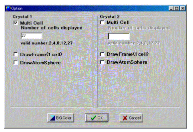 単位格子だけではわかりにくい結晶構造を,複数のセルを表示することでより理解しやすくなる場合がある。そこで結晶構造の表示セル数を複数セル設定ダイアログ(Figure 7)によって1,2,4,8,12,27セルから選べるようなっている。複数セル設定を行うにはMulti Cellチェックボックスにチェックを入れ,その下のエディットに表示したいセル数を入力する。