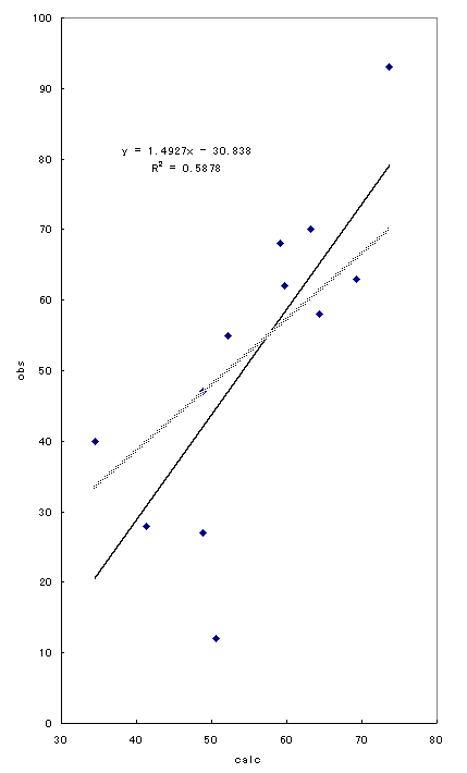 Figure 7. Correlation between observed and calculated 80% elution.(days) by Ck class interpolationgray line: y=x, black line: regression line y=0.6597x+40.914, R2 =0.2433