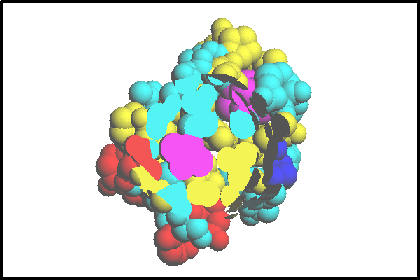 図3、4はいずれもデータの変換を行った後、VRMLビューワーを用いフェレドキシン分子の表示を行ったものである。図3ではアミノ酸残基毎の色分けになっており、その他にも原子毎、鎖毎の色分けが可能である。